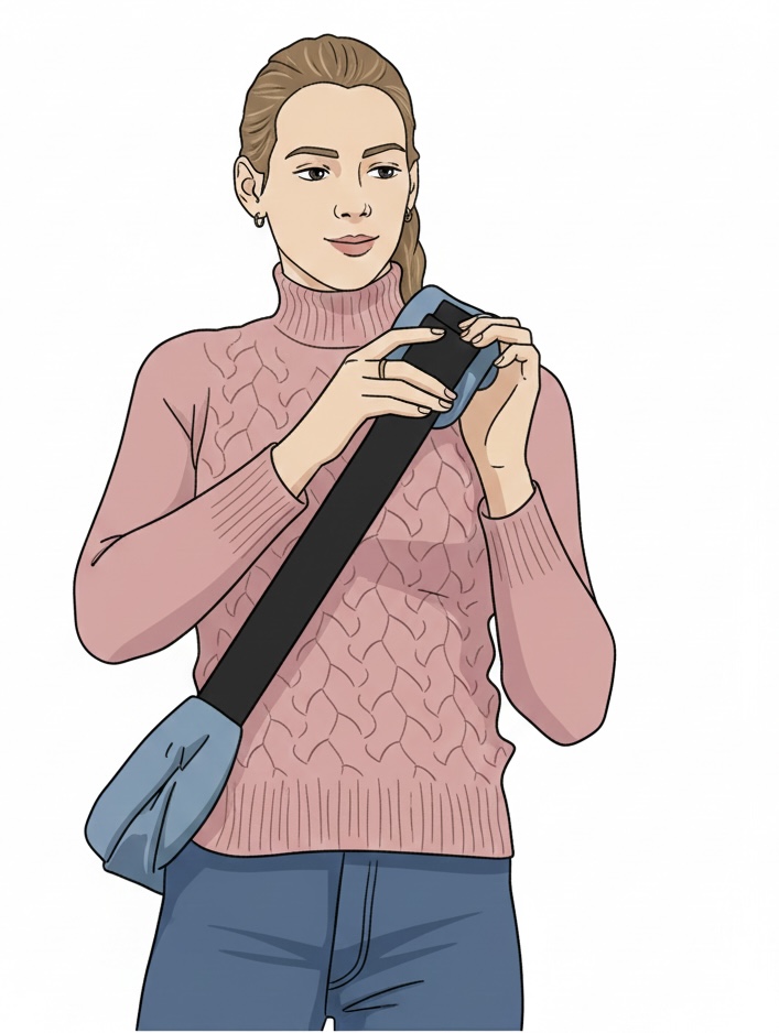 Prehoďte si nosič cez rameno (krížom cez hruď). Pracka na zapínanie smeruje dopredu.
